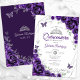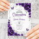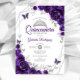 Convite para comemoração de Quinceanera roxa, prata e branca. Recursos, fontes de script, borboletas, rosas de aquarela e tiara. Perfeito para uma elegante celebração de glam estilo princesa. Personalize com seus próprios detalhes. Impressos convites Zazzle ou modelo de impressão digital instantânea para download.
