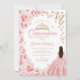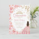 Convite para celebração da Quinceanera, cor-de-rosa, ouro e floral branca. Possui uma garota morena em vestidos de vestido de bola, fonte de script, borboletas douradas, rosas rosa pinceladas e tiara. Perfeito para uma elegante celebração de glam estilo princesa. Personalize com seus próprios detalhes. Impressos convites Zazzle ou modelo de impressão digital instantânea para download.