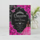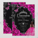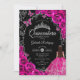 O convite para comemoração da Quinceanera, cor-de-rosa, prata e negra. Apresenta uma garota morena em vestidos de capa de bola, fonte de script, borboletas, rosas de aquarela e tiara. Perfeito para uma elegante celebração de glam estilo princesa. Personalize com seus próprios detalhes. Impressos convites Zazzle ou modelo de impressão digital instantânea para download.