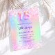 Um convite de festas de Quinceañera feminino e feminino. Na frente: Um arco-íris, fundo holográfico colorido em roxo, rosa, verde-menta. Decorado com confete cor-de-rosa penteado. Personalize e adicione um nome e detalhes da parte. O nome é escrito com um script de estilo manuscrito, letras cor roxa.