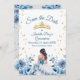 Anuncie seu dia especial em estilo com esta Quinceañera Light Princesa Azul Salve o Convite para a Data! Apresentando uma ilustração espantosa de uma jovem dama em um vestido de princesa azul-claro adornado com uma delicada tiara, esta design captura a magia e elegância de uma celebração da Quinceañera. Os arranjos florais suaves complementam o tema real, criando um eterno e um olhar sofisticado. Com um roteiro elegante e emparelhamento de fontes minimalista, este cartão Salvar a Data é perfeito para definir o tom de uma Quinceañera inesquecível. Personalize-o com seus detalhes de eventos e certifique-se de que seus convidados marquem seus calendários para esta celebração única! Principais recursos: vestido de princesa azul clara e sotaques florais elegantes tiara design para um sofisticado script touch Na moda e combinação de fontes minimalista Totalmente personalizável com seus detalhes de evento Perfeito para um Quinceañera Salve o lançamento Data