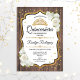 O convite para comemoração da Quinceanera, dourado branco de madeira russa. Apresenta fontes de script, rosas brancas, tiara e confetti. Design clássico com ouro falso brilhante. Perfeito para uma elegante celebração de glam.