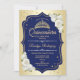 Dourado convite para comemoração da Quinceanera branca negra. Apresenta fontes de script, rosas brancas, tiara e confetti. Design azul marinho clássico com ouro falso brilhante. Perfeito para uma elegante celebração de glam.