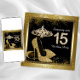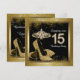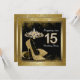 Linda pisada negra e dourada Quinceañera convida com água brilhante e calçados de salto alto de ouro. Você pode personalizar facilmente este elegante convite de aniversário preto e dourado entrando em 15 para o seu evento simplesmente adicionando seus detalhes no estilo de fonte e na cor e no texto de sua escolha. Você também pode apagar o vidro.
