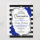 Convite para comemoração da Quinceanera branca, preto prateado. Recursos stripes, fonte de script, rosas azuis reais, tiara e confetti. Design azul de safira clássica com prata brilhante falso. Perfeito para uma elegante celebração de glam.