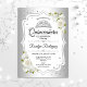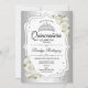 Convite para comemoração da Quinceanera branca prateada. Apresenta faixas, fontes de script, rosas brancas, tiara e confetti. Design clássico com ouro falso brilhante. Perfeito para uma elegante celebração de glam.