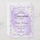 Convite de festas de Quinceanera. Design elegante em roxo e prata. Apresenta fontes de script, rosas brancas, tiara e confetti. Design clássico com folha de prata brilhante falso. Perfeito para uma comemoração de na moda.