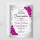 Convite para comemoração da Quinceanera branca, preto prateado. Apresenta fontes de script, rosas rosa-quente, tiara e confetti. Design de falso fuchsia com prata brilhante. Perfeito para uma elegante celebração de glam.