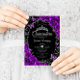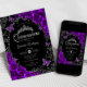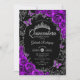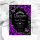 Convite para comemoração de Quinceanera roxa, prata e negra. Recursos, fontes de script, borboletas, rosas de aquarela e tiara. Perfeito para uma elegante celebração de glam estilo princesa. Personalize com seus próprios detalhes. Impressos convites Zazzle ou modelo de impressão digital instantânea para download.