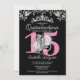 Quinceanera, bonito cor-de-rosa e prata, brilha na princesa preta tiara, rosas e saltos altos com uma borda de folha cardíaca brilhante prateada no topo do convite. Um belo aniversário de 15 no estilo chic.
