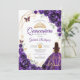 Convite para comemoração de Quinceanera roxo, ouro e branco. Recursos, garota morena em vestido de gola, fonte de guião, borboletas douradas, rosas de aquarela e tiara. Perfeito para uma elegante celebração de glam estilo princesa. Personalize com seus próprios detalhes. Impressos convites Zazzle ou modelo de impressão digital instantânea para download.