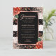 Belo convite de festas floral de ouro preto e rosa com quinceñera, com rosas vermelhas de aquarelas e um confete de ouro rosa contra fundo preto e branco.