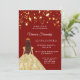 Um fundo vermelho. Decorado com estrelas ouros e uma garota vestindo uma tiara e um vestido de ouro. Personalize e adicione um nome e detalhes.