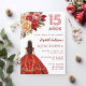 Um convite moderno, na moda e glamouroso para uma Quinceañera, festa de aniversário 15. Um fundo branco, uma garota vestindo um vestido vermelho e dourado e rosas vermelhos, cor-de-rosa e ouro, florais. O nome é escrito com um moderno estilo escrito à mão. Personalize e adicione os detalhes da sua festa.