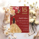 Um convite moderno, na moda e glamouroso para uma Quinceañera, festa de aniversário 15. Um fundo vermelho, uma garota vestindo um vestido de ouro e rosas vermelhos, cor-de-rosa e ouros, florais. O nome é escrito com um moderno estilo escrito à mão. Personalize e adicione os detalhes da sua festa.