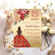 Um convite moderno, na moda e glamouroso para uma Quinceañera, festa de aniversário 15. Um fundo de ouro falso, uma garota vestindo um vestido vermelho e dourado e rosas vermelhos, cor-de-rosa e ouro, florais. O nome é escrito com um moderno estilo escrito à mão. Personalize e adicione os detalhes da sua festa.