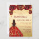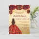 Um convite moderno, na moda e glamouroso para uma Quinceañera, festa de aniversário 15. Um fundo de ouro falso com brilho de ouro falso, uma garota vestindo um vestido vermelho e dourado e rosas vermelhas, florais. O nome é escrito com um moderno estilo escrito à mão. Personalize e adicione os detalhes da sua festa.
