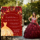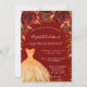 Um convite moderno, na moda e glamouroso para uma Quinceañera, festa de aniversário 15. Um fundo vermelho com pó de ouro falso, um vestido e rosas vermelhas, florais. O nome é escrito com um moderno estilo escrito à mão. Personalize e adicione os detalhes da sua festa.