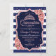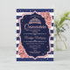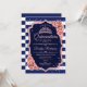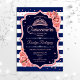 Rosa ouro, convite para celebração do marinho Quinceanera. Apresenta cor damasco, listras, fontes de script, rosas rosa, tiara e confetti. Design azul de marinho clássico com ouro rosa de brilho sujo. Perfeito para uma elegante celebração de glam.