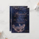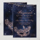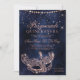 Uma QUINCEAÑERA moderna, quic e glamourosa, com uma máscara de mascarada dourada desenhada à mão com faíscas de diamante brilhante rosa em um fundo azul-marinho escuro de cor d'água.
