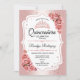Convite para comemoração da Quinceanera branca rosa. Apresenta a fonte do script, rosas cor-de-rosa pinceladas, tiara e confetti. Design clássico com ouro falso brilhante. Perfeito para uma elegante celebração de glam.