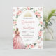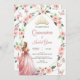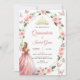 Celebre seu dia especial com estilo com esse Dourado Convite Quinceañera e Rosa Esmagado. Apresentando uma coroa de ouro real, delicadas borboletas voadoras e uma sofisticada borda de ouro com rosas cor-de-rosa macia, esta elegante design também mostra uma garota com um vestido cor-de-rosa esbranquiçado e fluente, acrescentando um toque princesa. Perfeito para as comemorações de Mis Quince Años. BRT342