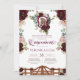 Este elegante convite para o charro theme quinceanera apresenta belíssimos rosas de burgundy escura, com sotaques rosa pincelados, uma crista com um belo cavalo aquoso e as portas de boas-vindas a uma fazenda em chamas. Personalize completamente todo o texto para tornar isso seu. Consulte o compro para outras versões deste design e acessórios correspondentes