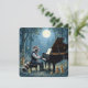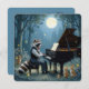 Um guaxinim em traje formal toca piano de cauda em uma floresta iluminada pela lua, enquanto um grupo de coelhos escuta atentamente os vagalumes iluminam a cena. Todo o texto pode ser alterado.