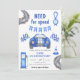 Festa de aniversário. Convide convidados para uma festa de aniversário de estilo com corrida de carros. Trilha de corridas de aquarela, posto de gasolina, bandeira de corrida, carro de corridas azul.