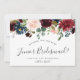 O cartão de apresentação do partido floral Chic apresenta uma fronteira superior de burgundy marsala, flores azul-pinceladas e marinhos, com folhagem botânica e verde-limpas. Personalize com seus detalhes de pedido de madrinha júnior (mostrados com "você será minha madrinha jr? Eu não posso dizer que eu não tenho você") em modernos textos escritos à mão e em letras sans serif tradicionais. Convites invertendo a uma joia rica em azul-marinho.
