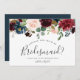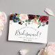 O cartão de apresentação do partido floral Chic apresenta uma fronteira superior de burgundy marsala, flores azul-pinceladas e marinhos, com folhagem botânica e verde-limpas. Personalize com os detalhes da sua madrinha (mostrada com "você será minha madrinha?" Eu não posso dizer que eu não tenho você") em modernos textos escritos à mão e em letras sans serif tradicionais. Convites invertendo a uma joia rica em azul-marinho.