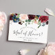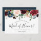 O cartão de apresentação do partido floral Chic apresenta uma fronteira superior de burgundy marsala, flores azul-pinceladas e marinhos, com folhagem botânica e verde-limpas. Personalize com seus detalhes de solicitação de madrinha de casamento (mostrados com "você será minha madrinha de casamento?" Eu não posso dizer que eu não tenho você") em modernos textos escritos à mão e em letras sans serif tradicionais. Convites invertendo a uma joia rica em azul-marinho.