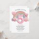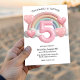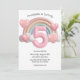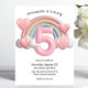 This custom 5th birthday party invitation feature a glossy 3D look with a giant number "5" in the center. A pastel colored rainbow with clouds is placed in the back, with chubby pink hearts around the sides. It's a colorful and playful invite perfect for a little girl's fifth birthday.