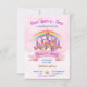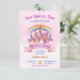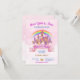 O convite apresenta um castelo de fada giro e arco-íris num fundo cor-de-rosa.