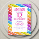 Você está pronto para borrifar um pouco de brilho e cor em sua comemoração de aniversário? Este design de aniversário é perfeito para o dia especial da sua garota, projetado com toda a diversão que ela merece! Apresentando um pano de fundo vibrante das listras do arco-íris, este convite é o epítome de lindas, bonito e ousadas! Quer ela esteja fazendo 5 ou 25 anos, nosso convite é feito à medida para crianças, adolescentes e jovens adultos! Brilhante, divertida, e arrebentando com cor, esta design moderna vai pegar o olho de todos. O texto rosa quente e roxo adiciona um pop extra de entusiasmo, definindo o palco para uma festa de aniversário cheia de risos e alegria!