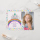 Bonita, gira, rosa, mágica, convite de aniversário do arco-íris para crianças, com foto da menina das estrelas coloridas e do unicórnio do gato kawaii.