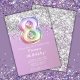 Convite de aniversário brilhante do arco-íris para uma menina de 8 anos com escrevendo de script elegante e balões de folha de números divertidos.