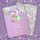 Convite de aniversário brilhante do arco-íris para uma menina de 3 anos com escrevendo de script elegante e balões de folha de números divertidos.