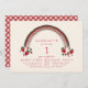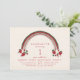 Tema do primeiro aniversário de Berry com ilustração do arco-íris rosa e vermelho com morangos, flores e folhas. O reverso é gingham vermelho. O texto é vermelho.