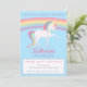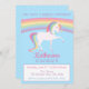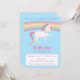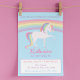 Este bonito convite de aniversário de unicórnio apresenta um arco-íris pastel e um unicórnio num fundo azul-céu. O convite do Rainbow Unicorn é perfeito para a festa de aniversário de sua garotinha.