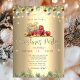 Um convite elegante para festas de férias com galhos de pinheiros, bola de Natal, presentes e lanternas de cordas em um fundo de ouro. Estes belos convites de Natal são perfeitos para convites de festas de janto de Natal, convites para troca de presentes de Natal, angariadores de fundos de Natal, convites para bolas de férias e outros eventos realizados durante o mês de dezembro. Use apenas os campos modelo para adicionar suas próprias informações de evento.