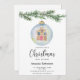 Ramo de inverno com um brinquedo. Convite para chá de fraldas de aquarela com galho de pinheiro de Natal com bolas de brinquedo de Ano Novo dentro de uma casa de pão de gengibre.