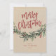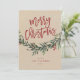 Um cartão festivo, vermelho, verde e Kraft de feliz natal com letra bold e folhagem de aquarela com folhas e bagas. Faz um ótimo cartão de saudação pessoal ou empresarial para as festas de fim de ano.