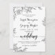 Roses em arte de linha preta se reúnem em torno do seu anúncio de casamento com uma caligrafia de fonte rústica e ornamentada. Um convite de casamento clássico minimalista em preto e branco.
