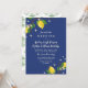 Um convite floral bonito do casamento em uma paleta de cores vibrante em amarelo, em verde, e o azul com limões, limão floresce, e as folhas do limão contra um fundo azul escuro.