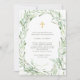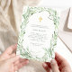 Este elegante, na moda, Primeiro Sagrado Convite da Comunidade, apresenta uma coroa aquática de ramos de oliveira mediterrâneos, sobre um delicado fundo branco com uma cruz falsa de ouro.