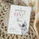 Um convite de aniversário coelho com um belo coelho preto e branco com chapéu de festa e pontos coloridos.