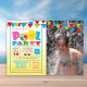 Convite de festas de piscina da garota com foto e texto colorido e borda em fundo amarelo de cor da água. Este convite de festas de piscina divertido é facilmente personalizado para o seu evento simplesmente adicionando a sua fotografia e os detalhes do evento.