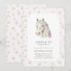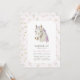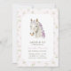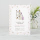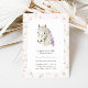 Saddle e reúna seus amigos e entes queridos para celebrar a festa de pônei da sua filha! Este design apresenta um cavalo branco, inspirado em coquetes, cor-de-rosa, com arcos cor-de-rosa e um padrão floral rosa suave.