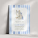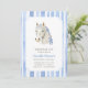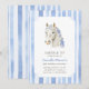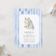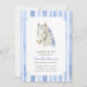 Saddle e reúna seus amigos e entes queridos para celebrar a festa de pônei da sua filha! Este design apresenta um cavalo branco inspirado em coquetes com arcos azuis e um padrão listrado de aquarela macia.